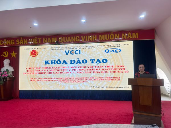 Ngày 22–23/4/2025, tại TP. Đà Lạt, Chi cục Thuế Khu vực XIII phối hợp với Trung tâm Truyền thông và Thông tin Kinh tế – VCCI (thuộc Liên đoàn Thương mại và Công nghiệp Việt Nam) và Công ty TNHH Tư vấn Tài chính và Kế toán FAC tổ chức lớp tập huấn “Cập nhật chính sách thuế và hóa đơn điện tử năm 2025”.